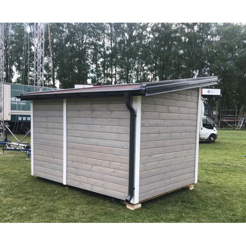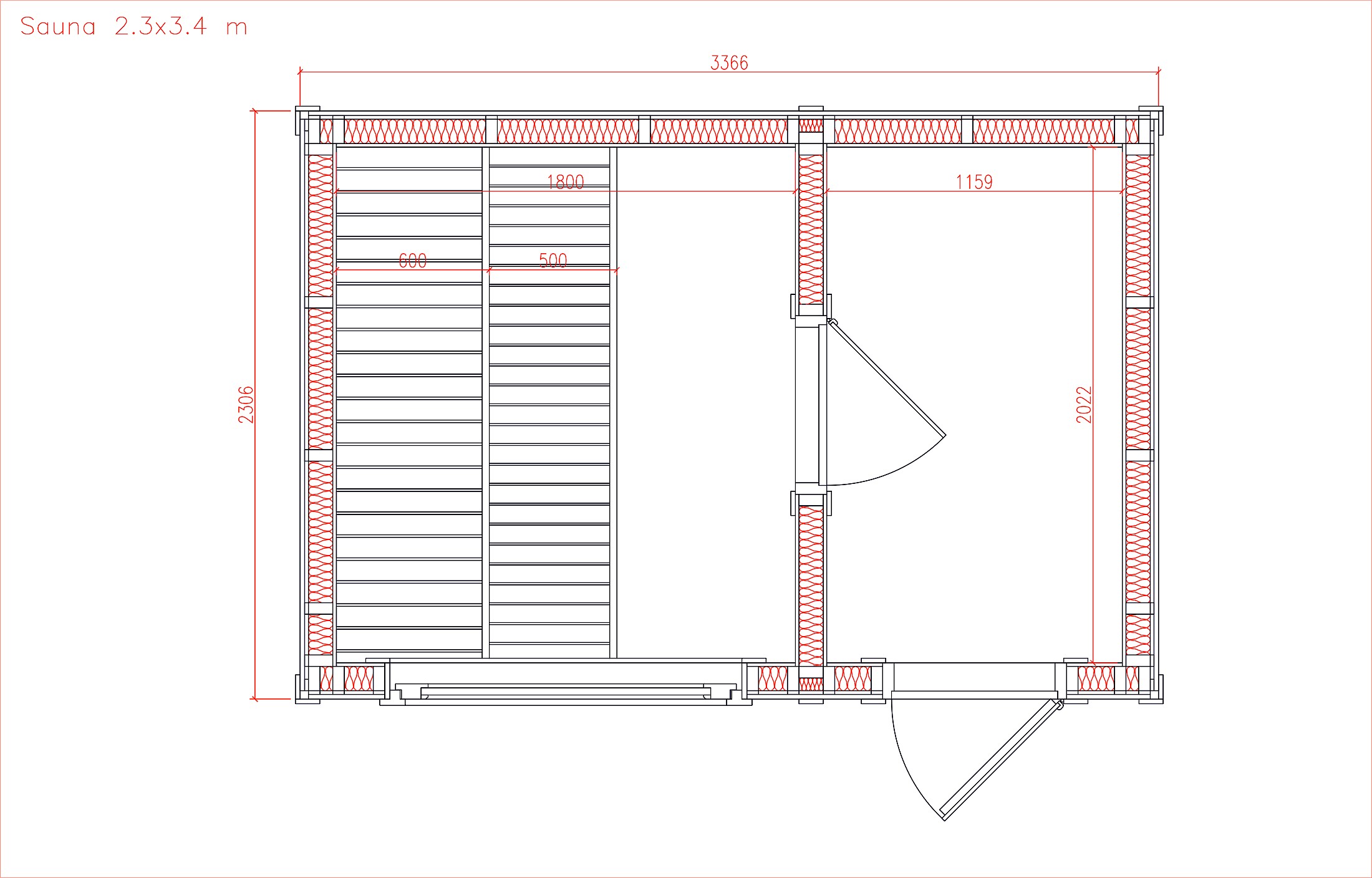 Isolierte Bodenplatten OSB von außen: 10 mm; Kieferndielen von innen: 28 mm; Isolierte Bodenstärke: 158 mm Isolierte Wandpaneele Kiefernholzverkleidung von außen: 18 mm; Schwarzerlen-/Lindenverkleidung von innen: 14 mm; Isolierte Wandstärke: 142 mm 2x gerade Bank auf 2 Ebenen in der Sauna Saunfenster doppelt verglastes Fenster aus gehärtetem Glas 420x1420 mm