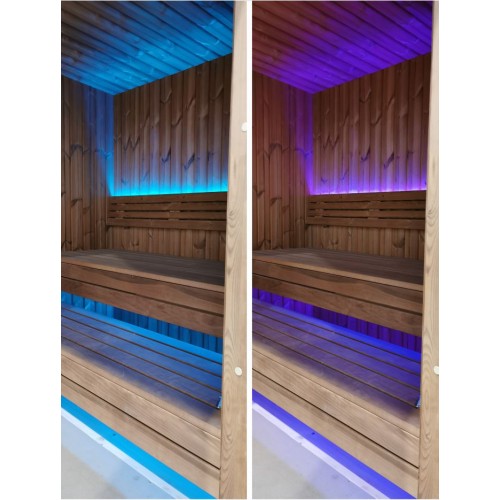 Isolierte Bodenplatten OSB von außen: 10 mm; Kieferndielen von innen: 28 mm; Isolierte Bodenstärke: 158 mm Isolierte Wandpaneele Thermowoodverkleidung von außen: 18 mm; Thermowoodverkleidung von innen: 14 mm; Isolierte Wandstärke: 142 mm 2x gerade Bank auf 2 Ebenen in der Sauna inklusive Rückenlehne aus Thermoholz 2x Saunafenster doppelt verglastes Fenster aus gehärtetem Glas 1940x1940 mm